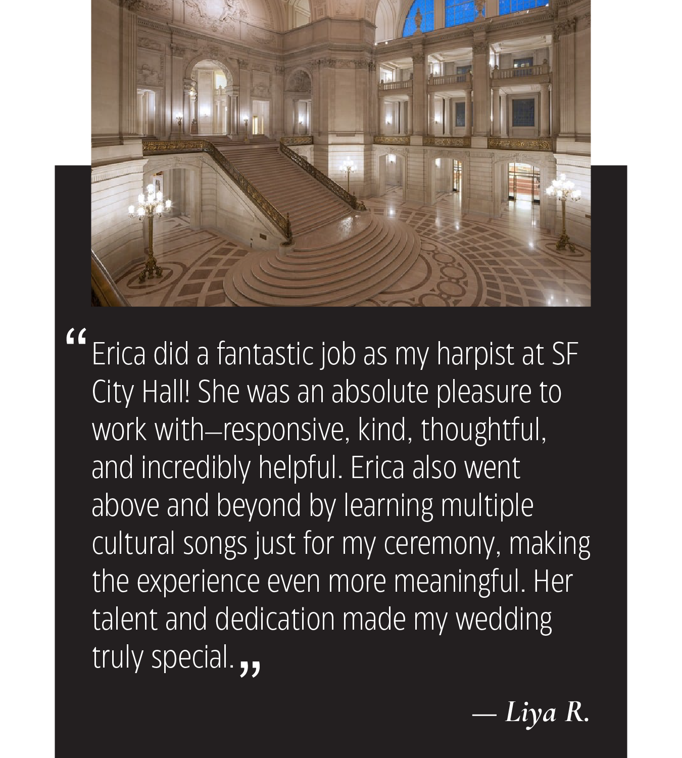 Reserved for clients who value discretion, beauty, elegant live music, and a heightened standard of presence, Erica offers live harp music that transforms any event into something unforgettable.